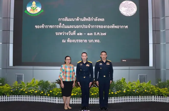 พลอากาศโท วิษณุ เนียมคำ เจ้ากรมกำลังพลทหารอากาศ เป็นประธานพิธีเปิดการสัมมนาด้านสิทธิกำลังพลของข้าราชการทั้งในและนอกประจำการของกองทัพอากาศ รวมถึงทายาท โดยมีนายทหารชั้นผู้ใหญ่ของกรมกำลังพลทหารอากาศ และผู้เข้าร่วมการอบรมฯ จำนวน ๑๒๐ คน เข้าร่วมพิธีฯ เมื่อวันพฤหัสบดีที่ ๑๒ ธันวาคม ๒๕๖๗ ณ ห้องบรรยาย กองบัญชาการกองทัพอากาศ