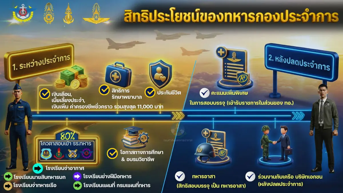 สวัสดิการ : ฟรี! เครื่องแต่งกาย ของใช้ส่วนตัว และสิทธิในการรักษาพยาบาลตลอดการรับราชการ