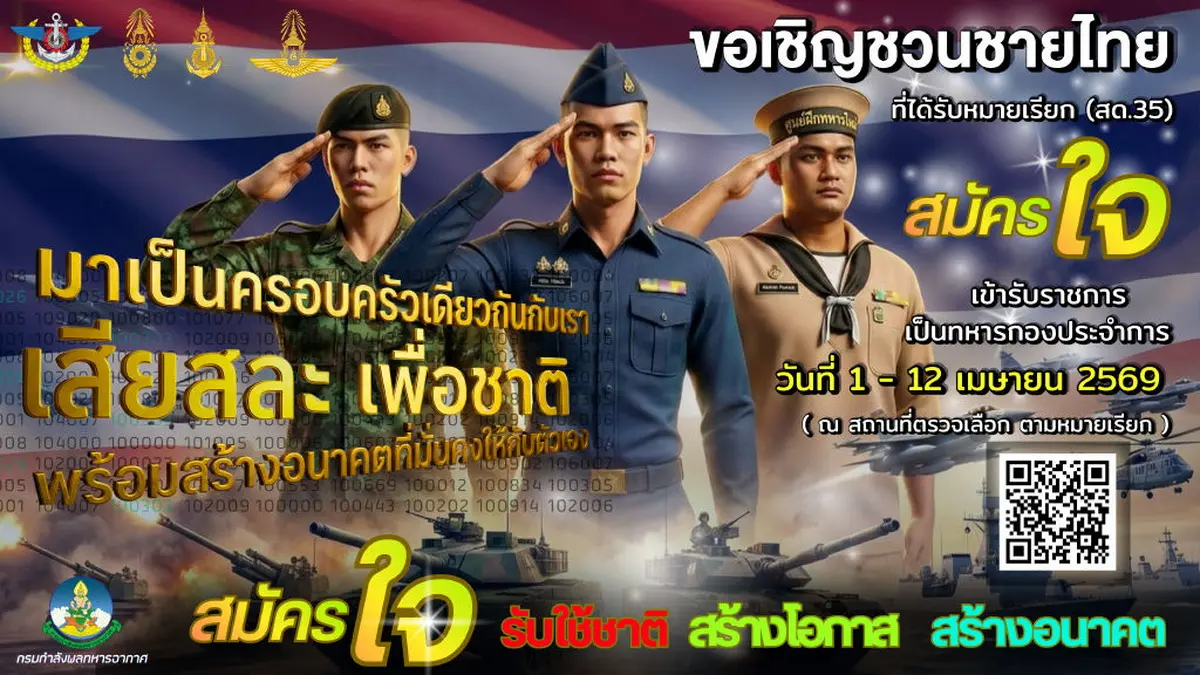 📢 กองทัพอากาศ ขอเชิญชวนชายไทยที่ได้รับหมายเรียกตรวจเลือกเข้ารับราชการทหารกองประจำการ ประจำปี ๒๕๖๙ เข้ารับการตรวจเลือกฯ ร้องขอเข้ากองประจำการในระหว่างวันที่ ๑ - ๑๒ เมษายน ๒๕๖๙
