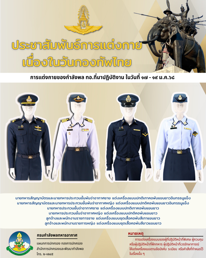 เนื่องด้วยวันเสาร์ที่ ๑๘ ม.ค.๖๘ เป็นวันกองทัพไทย กพ.ทอ.ขอประชาสัมพันธ์ให้กำลังพล ทอ.แต่งกายมาปฏิบัติงานในวันศุกร์ที่ ๑๗ ม.ค.๖๘ และวันอาทิตย์ที่ ๑๙ ม.ค.๖๘ ดังนี้
